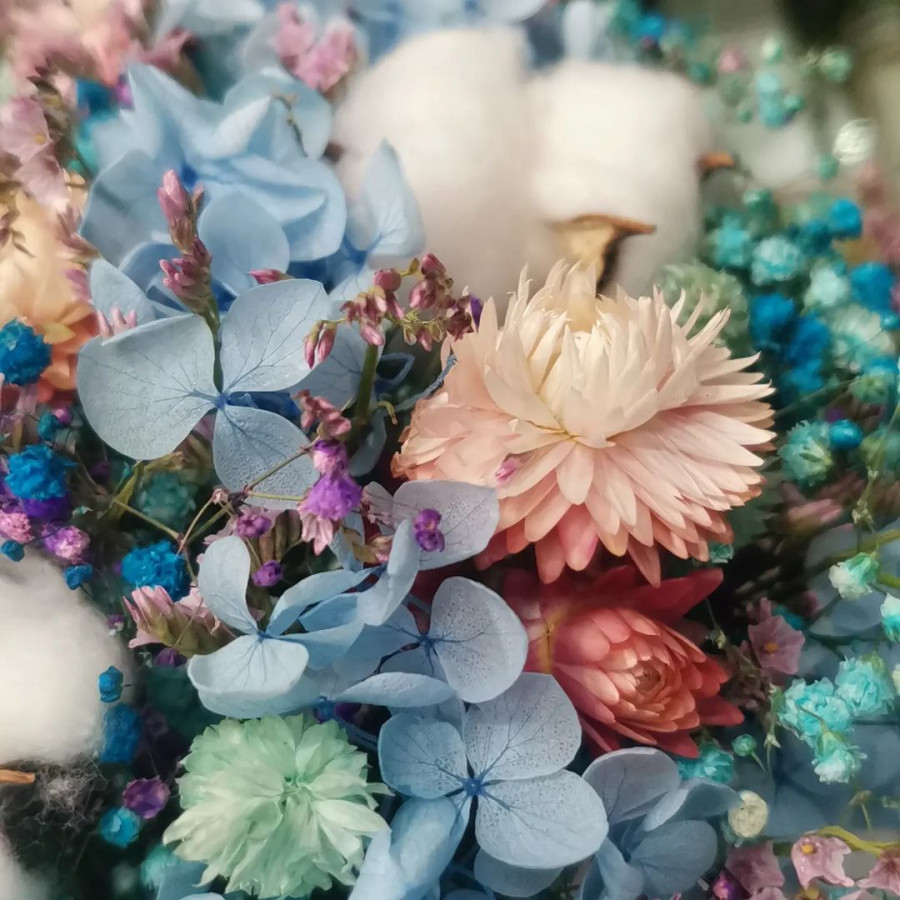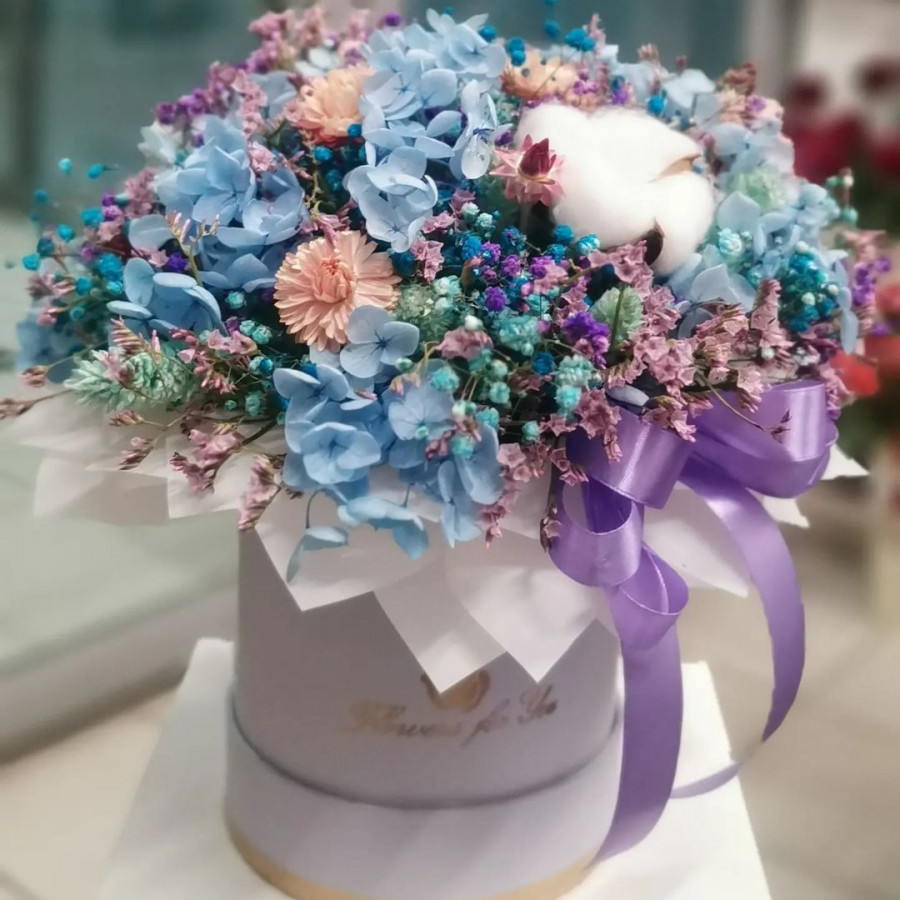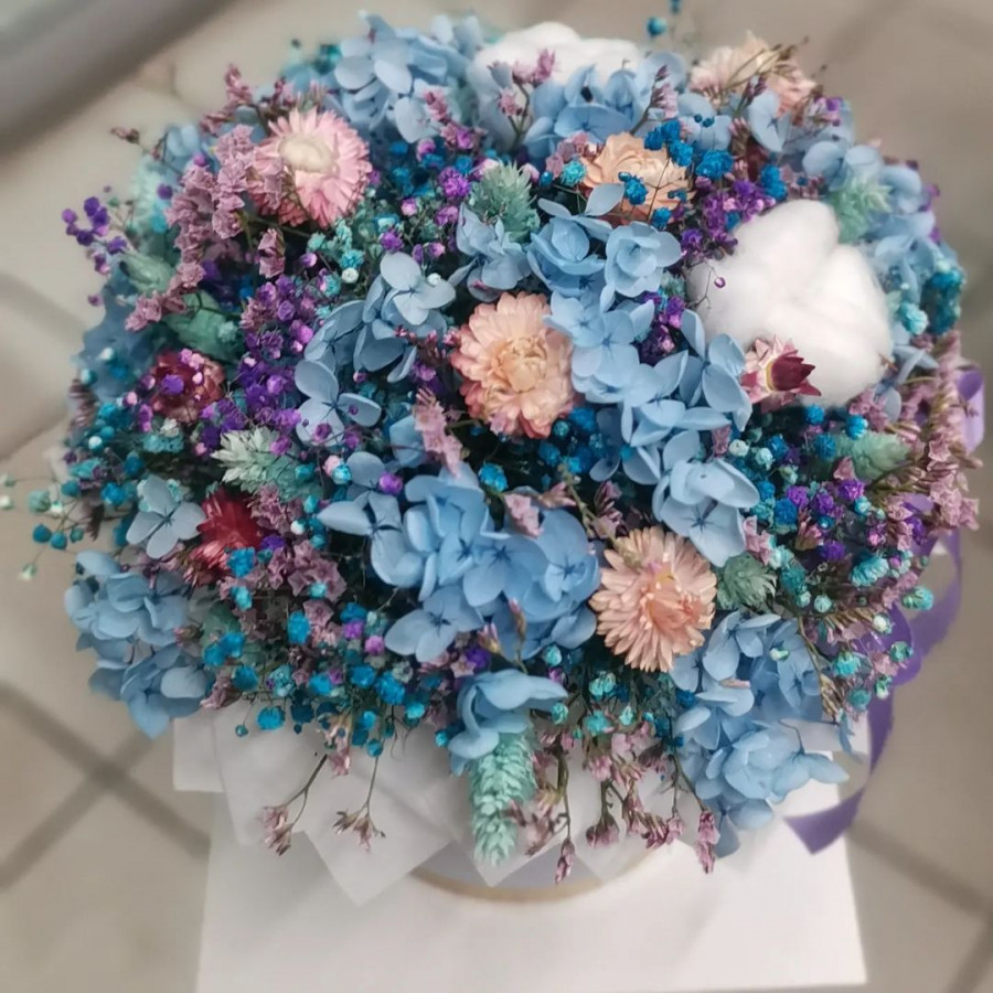 На фото бизнес композиция с гортензией в шляпной коробке. В составе: гортензия 2 шт, гипсофила 3 шт, хлопок 3 шт, сухоцветы (микс) 2 шт, коробка (s) 1 шт, . Все цветы свежие и ароматные, букет красиво оформлен и отлично подходит для подарка. Доступна доставка цветов или самовывоз.
