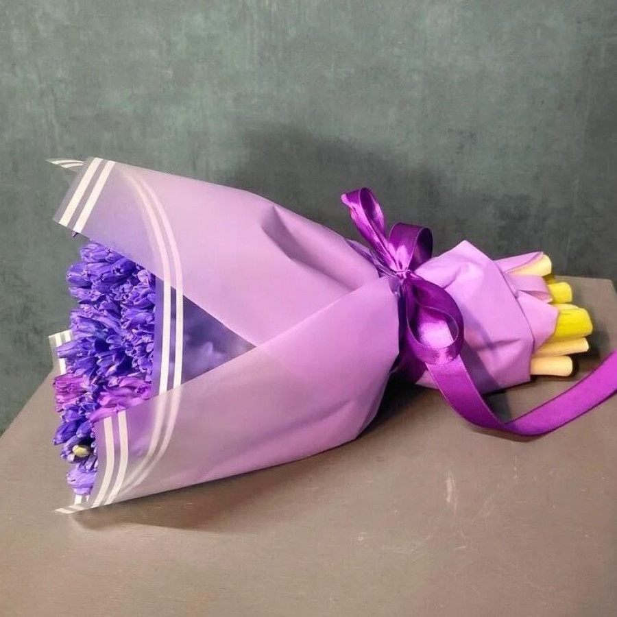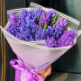 На фото букет из 15 синих гиацинтов. В составе: гиацинт 15 шт, крафт-бумага 1 шт, атласная лента 1 шт, . Все цветы свежие и ароматные, букет красиво оформлен и отлично подходит для подарка. Доступна доставка цветов или самовывоз.