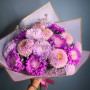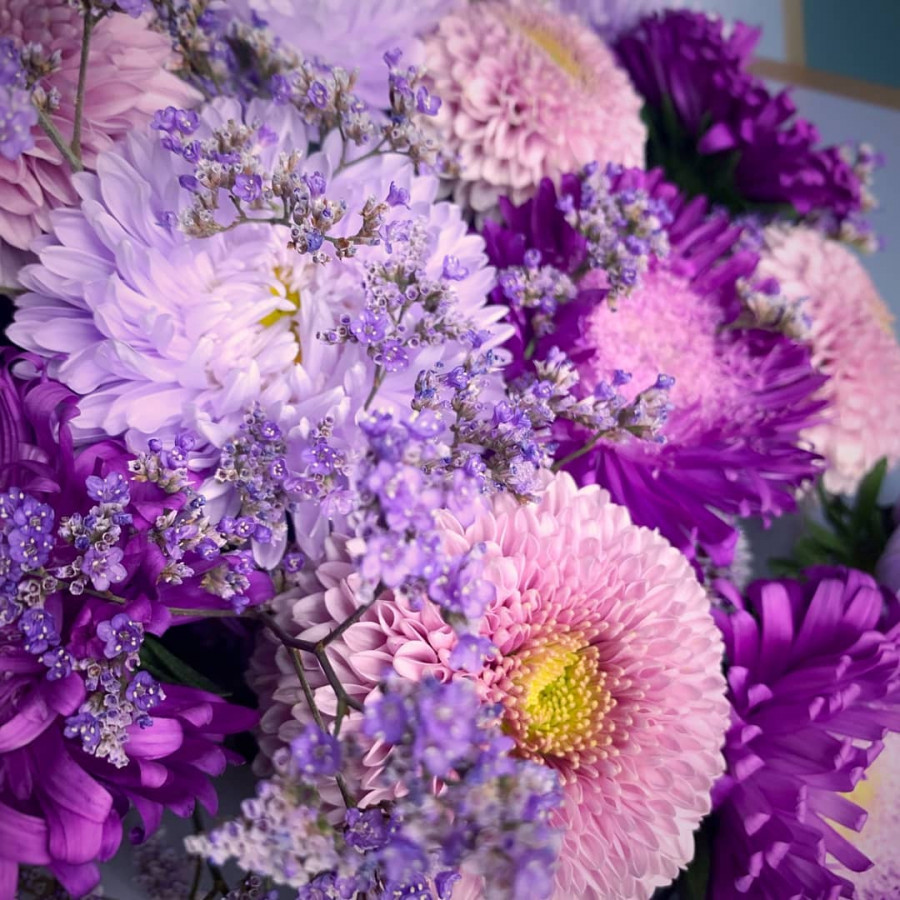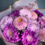 На фото букет из астр и лимониума. В составе: астра 17 шт, лимониум 5 шт, крафт-бумага 1 шт, атласная лента 1 шт, . Все цветы свежие и ароматные, букет красиво оформлен и отлично подходит для подарка. Доступна доставка цветов или самовывоз.