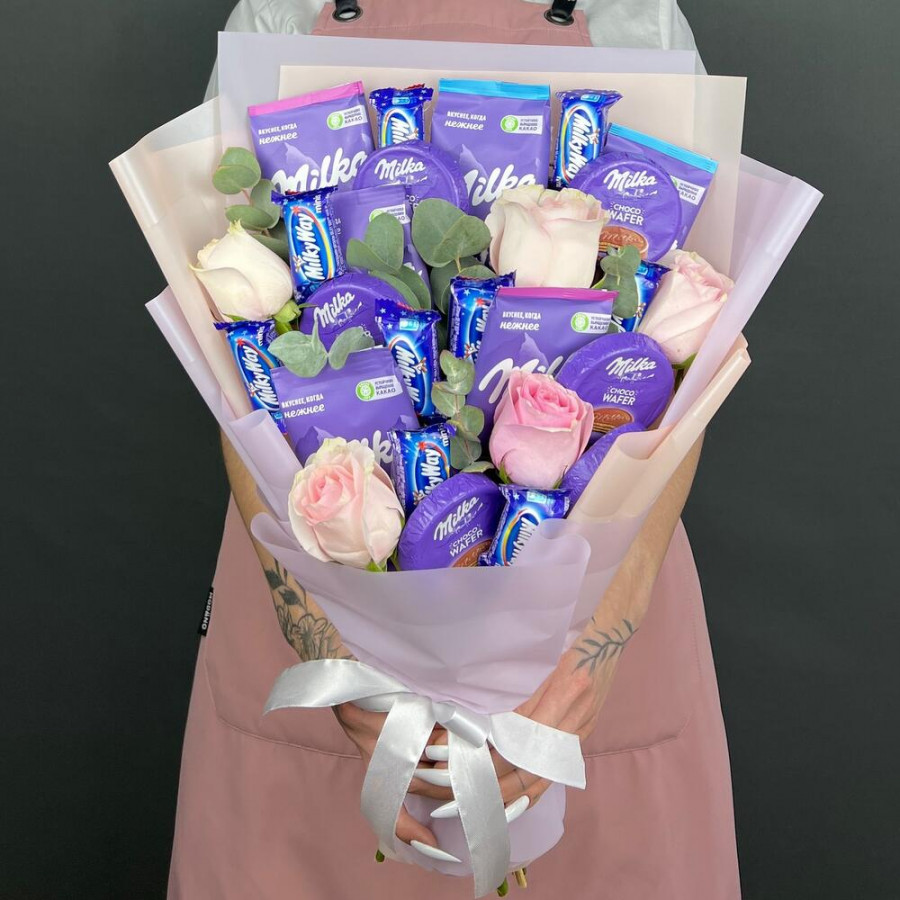 Роза одноголовая - 5 шт. Лента атласная - 1 шт. бумага дизайнерская - 6 шт. конфеты милки вей - 8 шт. конфеты milka плитка - 6 шт. конфеты milka медальки - 5 шт.
