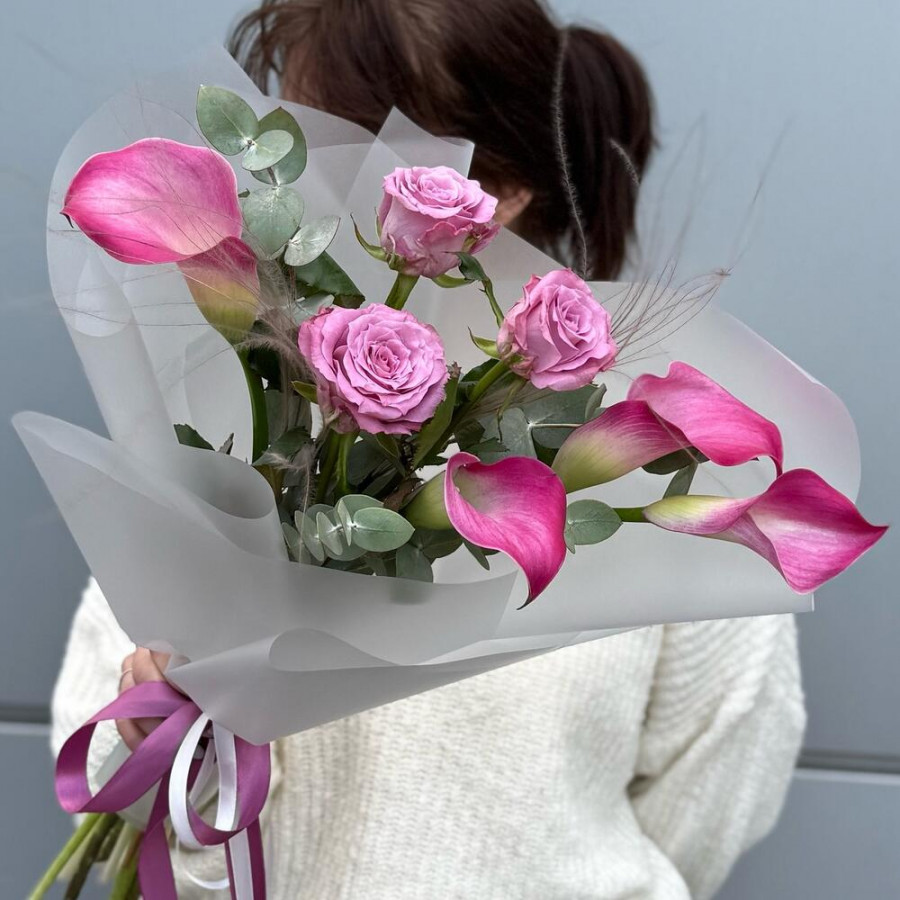 На фото букет «розовый восторг». В составе: калла 4 шт, роза 3 шт, зелень 2 шт, эвкалипт 1 шт, дизайнерская упаковка 1 шт, атласная лента 1 шт, . Все цветы свежие и ароматные, букет красиво оформлен и отлично подходит для подарка. Доступна доставка цветов или самовывоз.
